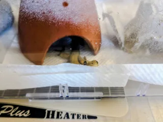 本日のヤモリです。1307日目 本日のヤモリ 2024.01.22 ↑↑↑ ウェットシェルターに半分身体を隠して休んでおりましたけもりさん♪ カメラを構えて覗き込んでみると… ばっちり気が付きましたやん☆ 素早く気配を感じ取るけもりさんに脱帽です◎ (Reno7にて)