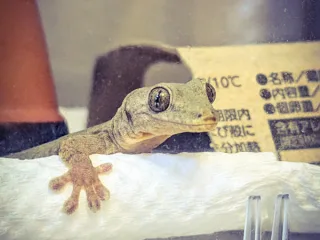 霧吹きしまして、水滴の中でへばり付いておりましたニホンヤモリのやもたろう氏です♪