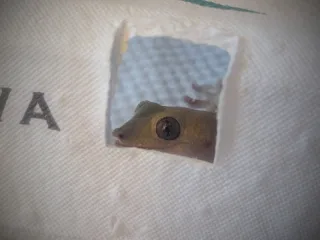 ウェットシェルターにへばりつく、いや、抱きかかえるような状態のニホンヤモリ!ひんやりして気持ちいいよねぇ〜☆
