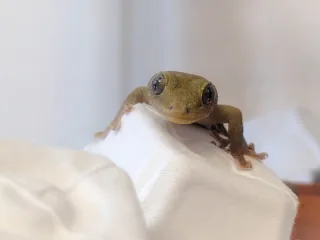 本日のヤモリです。1844日目 本日のヤモリ 2025.07.13 ↑↑↑ そーっとカメラを向けると… そこにはご覧の様子のけもりさんがおりました♪ なんですか?!と言わんばかりの目線でございます◎ 仕方がないのも無理はありません、だって寝てたんだも〜ん☆ (Pixel4a5gにて)