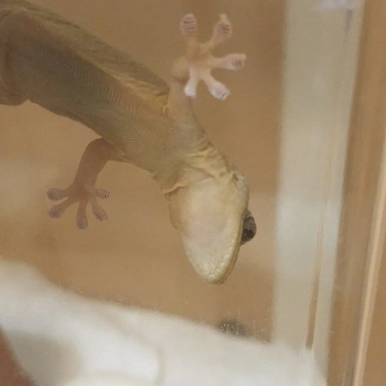本日のヤモリです。1931日目 本日のヤモリ 2025.10.08 ↑↑↑ 今日は、なかなか顔を見せてくれないやもたろう氏です◎ そんな日もあろうかと、過去作ver.にてお届けしようかとも思っておりましたが、本日のお腹側を撮影しました♪ おっ!いま、顔を向けてたー☆ (Pixel4a5gにて)