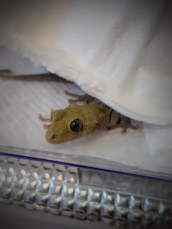 本日のヤモリです。1938日目 本日のヤモリ 2025.10.15 ↑↑↑ 恒例となりつつあります、けもりさんの爆睡タイムです♪ いつものように、こちらを見ているかと思いきや、ひと休み〜◎ 人間と同じく、ニホンヤモリも大変なのよ☆ (Pixel4a5gにて)