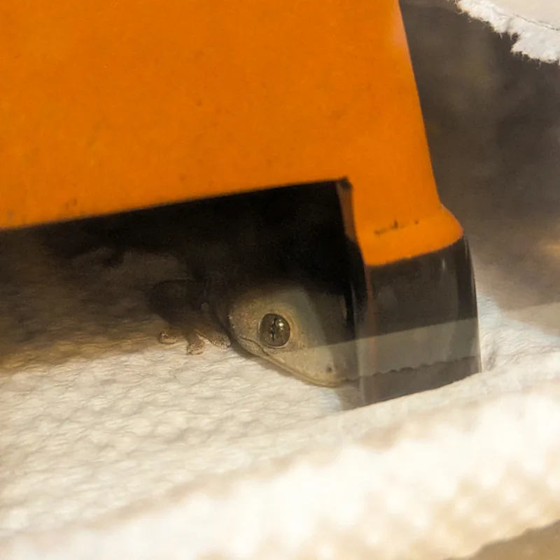 本日のヤモリです。1944日目 本日のヤモリ 2025.10.21 ↑↑↑ おやおや、今日はウェットシェルターの中にいて、ぐっすりお休みではないですか◎ スヤスヤという寝息が聞こえてきそうな、やもたろう氏です♪ 見ているこちらまで眠たくなってきてしまいました〜☆ (Pixel4a5gにて)