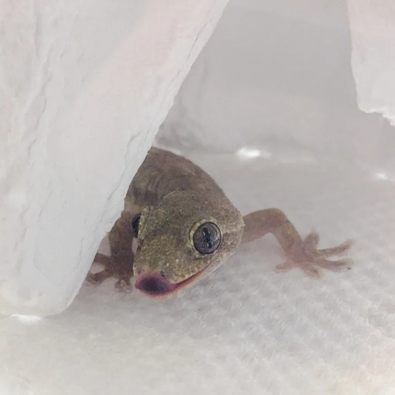 本日のヤモリです。1952日目 本日のヤモリ 2025.10.29 ↑↑↑ お食事タイム中の、けもりさんで〜す♪ イエコは、食べちゃったり、逃げ出したりでもう数がありません◎ したがって、レオパドライをたくさん食べてご満悦なのでした、の巻☆ (Pixel4a5gにて)
