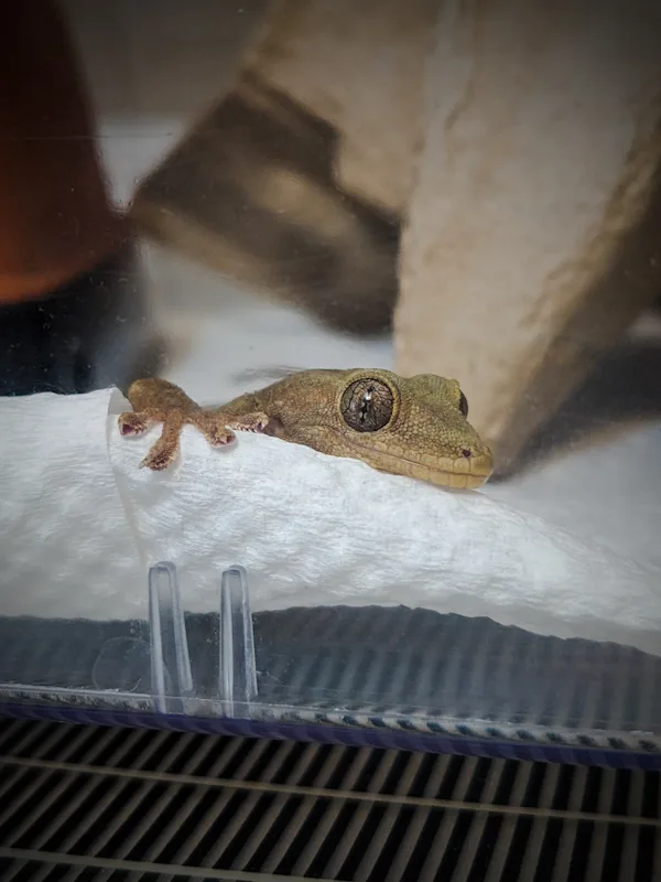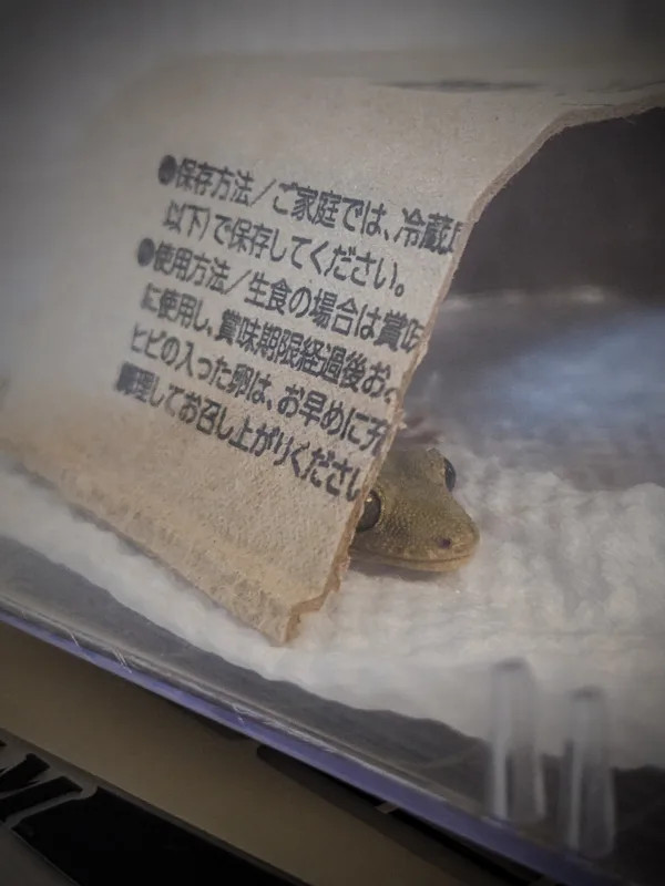 本日のヤモリです。1961日目 本日のヤモリ 2025.11.07 ↑↑↑ たまごケースにひっそりと隠れている、けもりさんです♪ パネルヒーターからの熱で、じんわりと温かいフロアに身を委ねておりました◎ 顔を見る限り、ぬくぬくタイムを満喫しているようです☆ (Pixel4a5gにて)