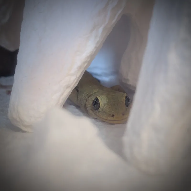 本日のヤモリです。1966日目 本日のヤモリ 2025.11.12 ↑↑↑ けもりさん、微動だにしません♪ 完全にパネルヒーターのトリコになっておりますよ〜◎ 気がつけば、昨日と同じところで休んでいて、こちらを伺うばかりでした☆ (Pixel4a5gにて)