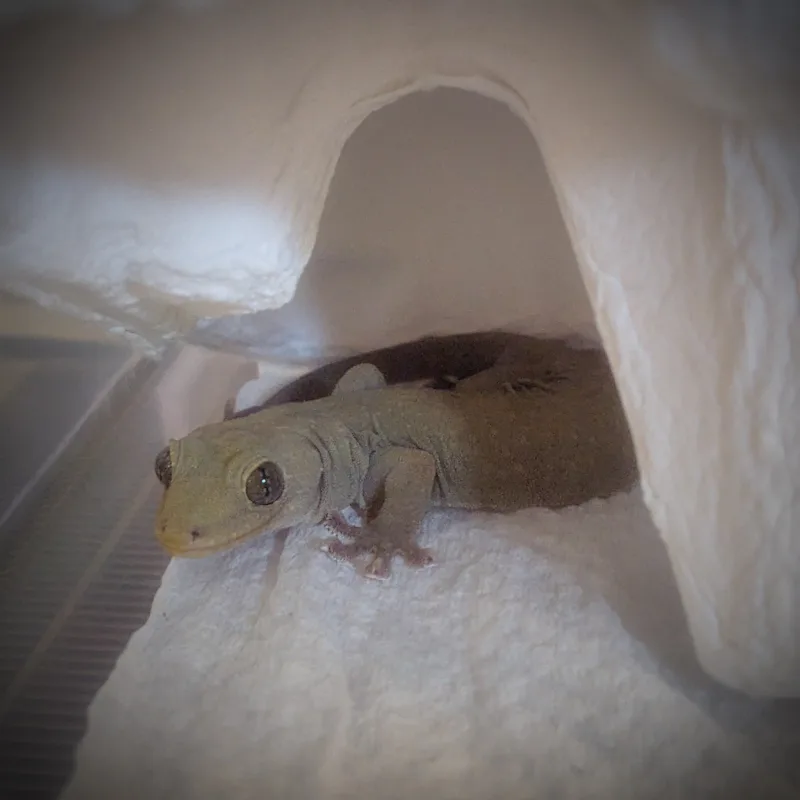 本日のヤモリです。1976日目 本日のヤモリ 2025.11.22 ↑↑↑ けもりさん、冬支度万全でおやすみタイムです♪ たまごケース&パネルヒーターで、ぬくぬく確定ですよ◎ 身体をこわさない様にしてもらって、強く冬を乗り越えて欲しいです☆ (Pixel4a5gにて)