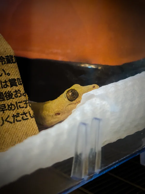 本日のヤモリです。1995日目 本日のヤモリ 2025.12.11 ↑↑↑ 出ました!あごのせニホンヤモリの、けもりさんです〜♪ とても狭いところから顔を出していて、たまりませんですね◎ 子どもさんから、ご飯を食べさせてもらって、ご機嫌そのもののようすでした☆☆☆ (Pixel4a5gにて)