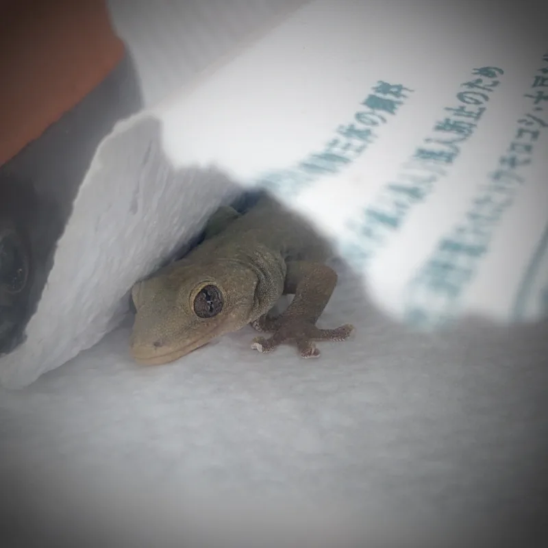 本日のヤモリです。2023日目 本日のヤモリ 2026.01.08 ↑↑↑ けもりさんの警戒心とは、このことです◎ たまごケースに、ひっそりと身をひそめて、こちらをうかがっておりました◎ けもりさんの気持ちは、よくわかるから、お願いだから、そんな顔しないで〜☆ (Pixel4a5gにて)
