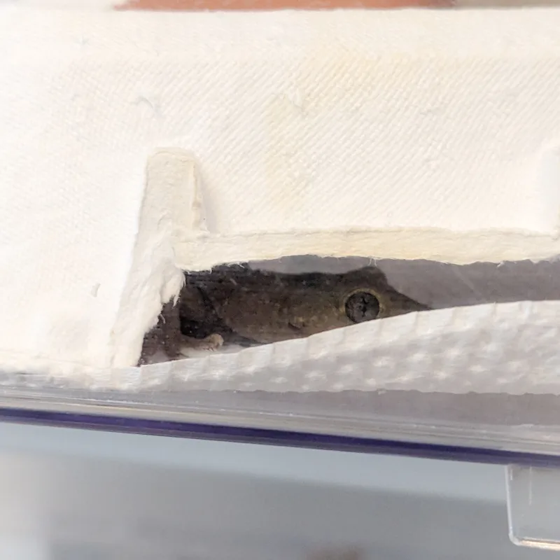 本日のヤモリです。2054日目 本日のヤモリ 2026.02.08 ↑↑↑ まだまだ寒い日が続きますねぇ◎ わが家のニホンヤモリ、けもりさんは、たまごケースの下に居て、じっと固まっておりました♪ うんうん、そうやって身を固めて寒さをしのぐんだぞ〜〜〜☆ (Pixel4a5gにて)