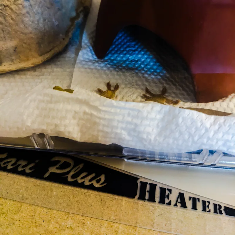 カメラを向けましたら、ご覧のようにクリアケースのフチっこ、キッチンペーパーの影に隠れてじっとしておりました♪